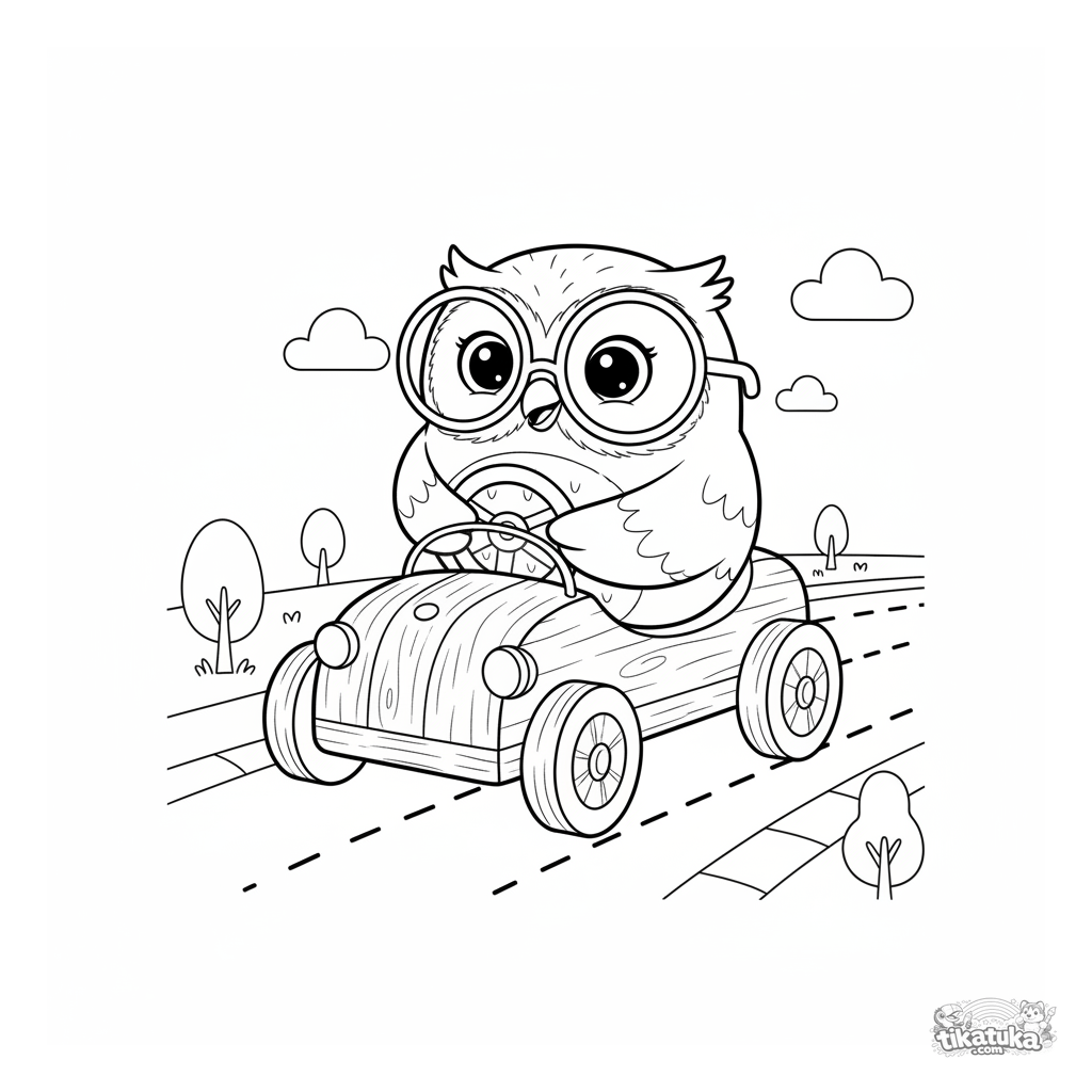 Ausmalbild für Jungen 4-6: Eule Oof fährt ein Holzspielzeugauto auf einer Rennstrecke. Geometrische Formen, skandinavischer Holzspielzeug-Stil.