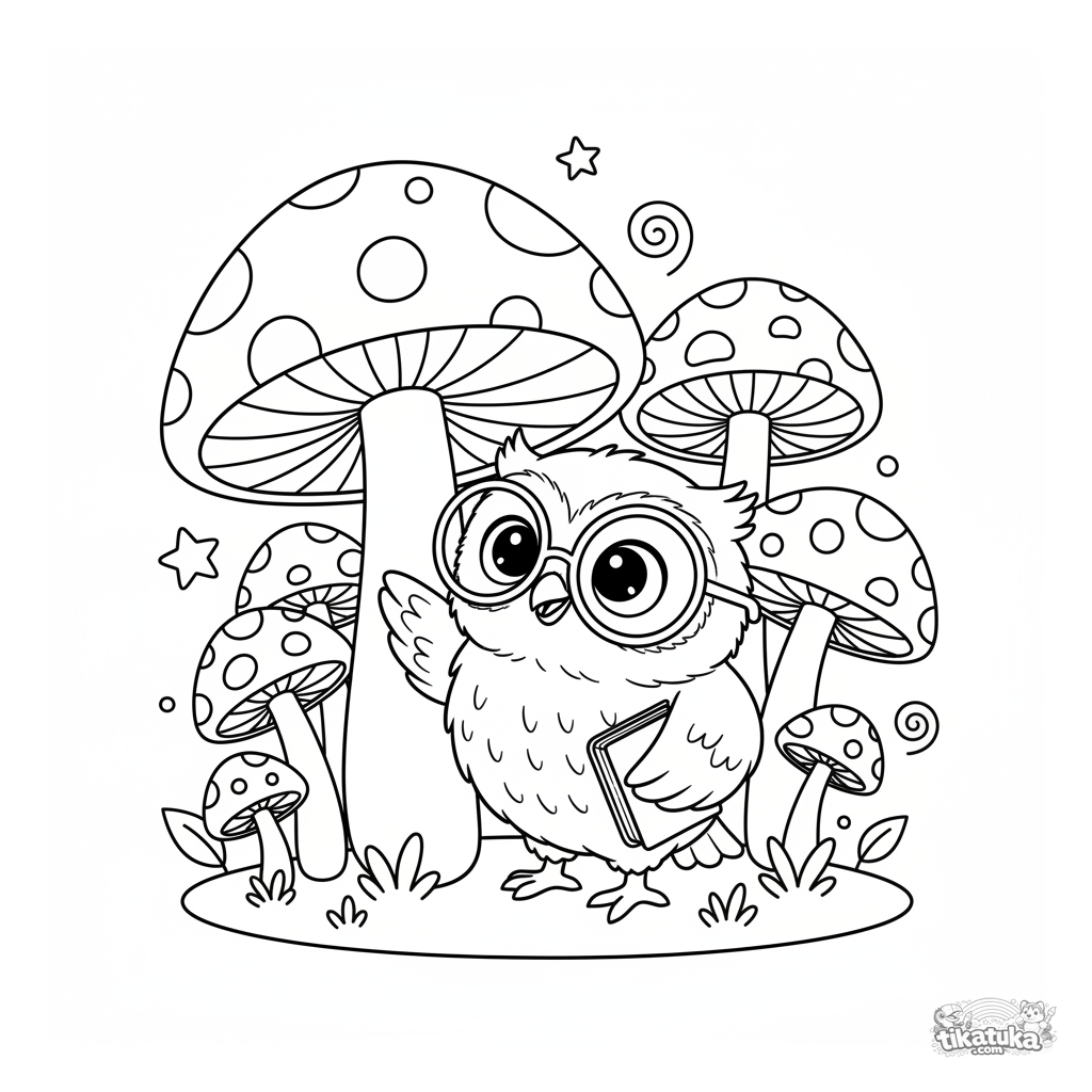 Ausmalbild für Kinder 4-6: Die neugierige Eule Oof erkundet einen magischen Wald mit Riesenpilzen. Plüschmaskottchen-Stil, einfache und klare Formen.