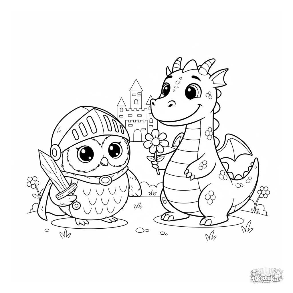 Ausmalbild für Kinder 4-6: Eule Oof in Ritterrüstung trifft einen sanften Drachen, der eine Blume hält. Friedliche Szene, einfache Formen.