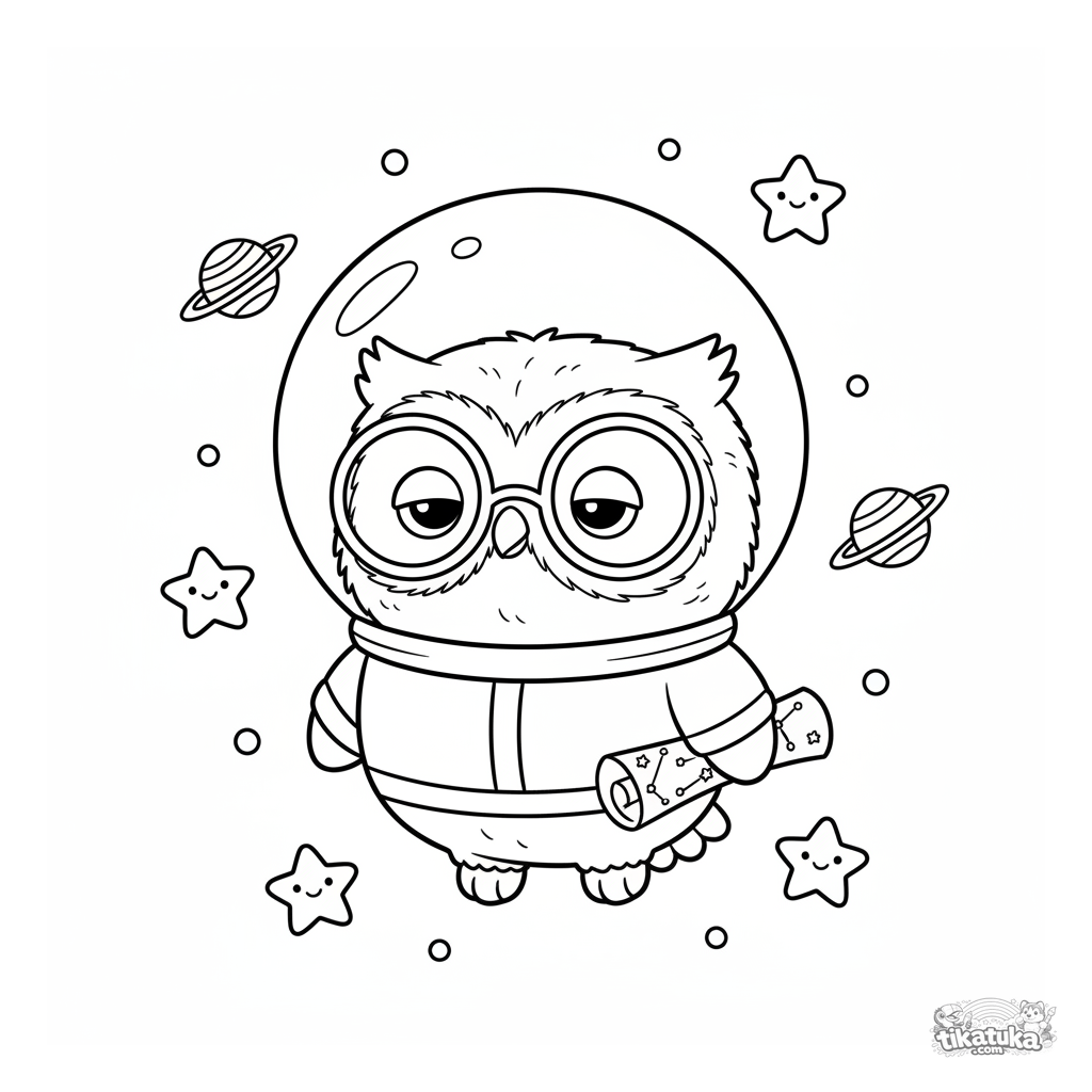 Ausmalbild für Kinder 4-6: Süße Eule Oof im Raumanzug schwebt zwischen Planeten. Einfache Linien, breite Ränder zum Ausmalen.