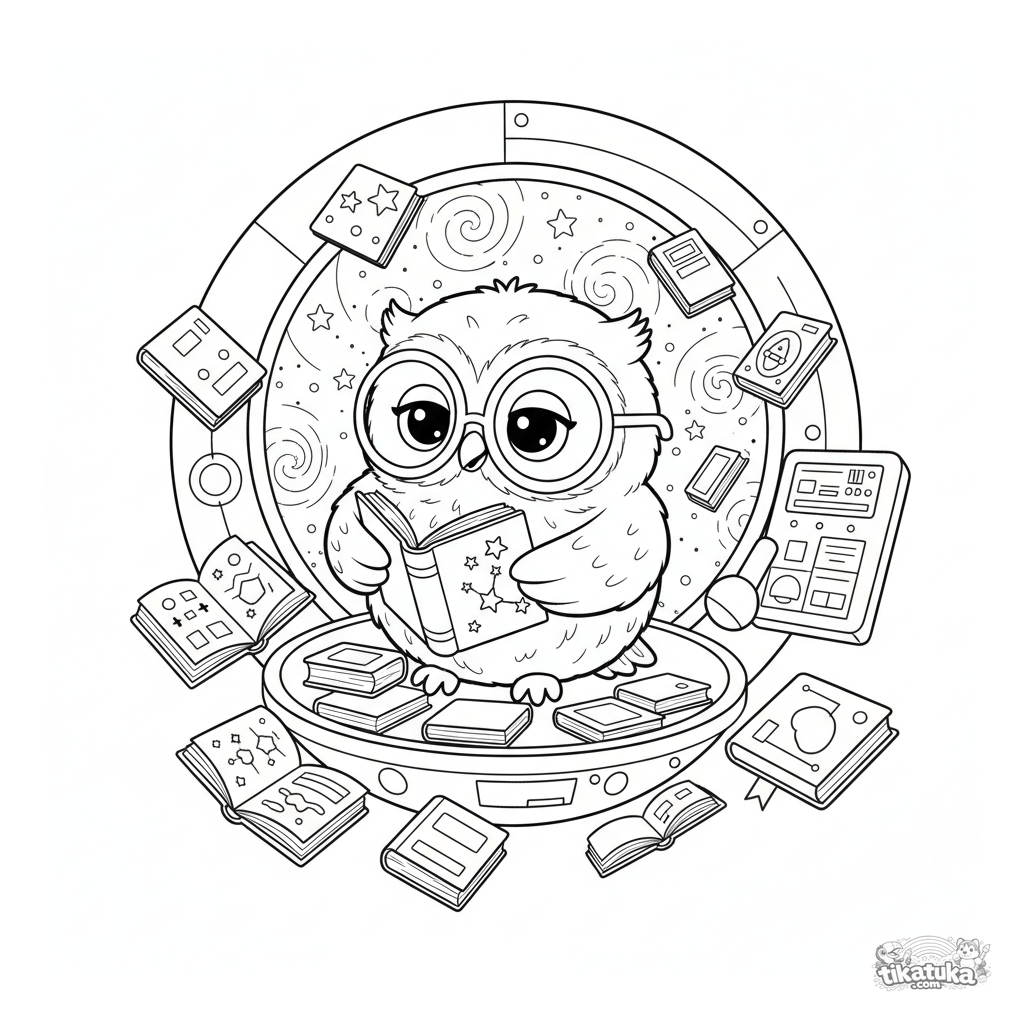 Ausmalbild für Kinder 4-6: Die süße Eulen-Bibliothekarin Oof schwebt in einer Weltraumbibliothek. Einfache Linien, skandinavischer Plüschtier-Stil.