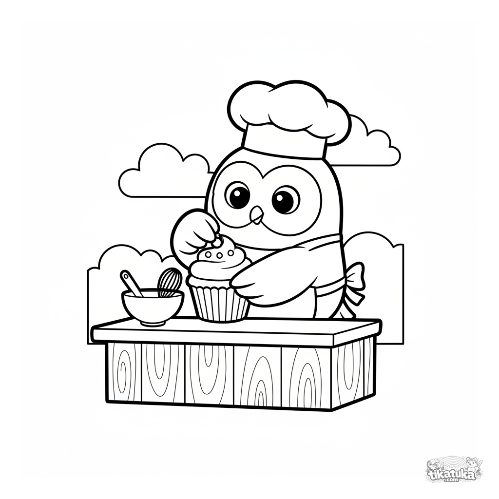 Ausmalbild für Kinder 4-6: Eulenbaby Oof als Bäcker, der einen leckeren Cupcake dekoriert. Niedliches Soft-Puppen-Design, skandinavische Ästhetik.