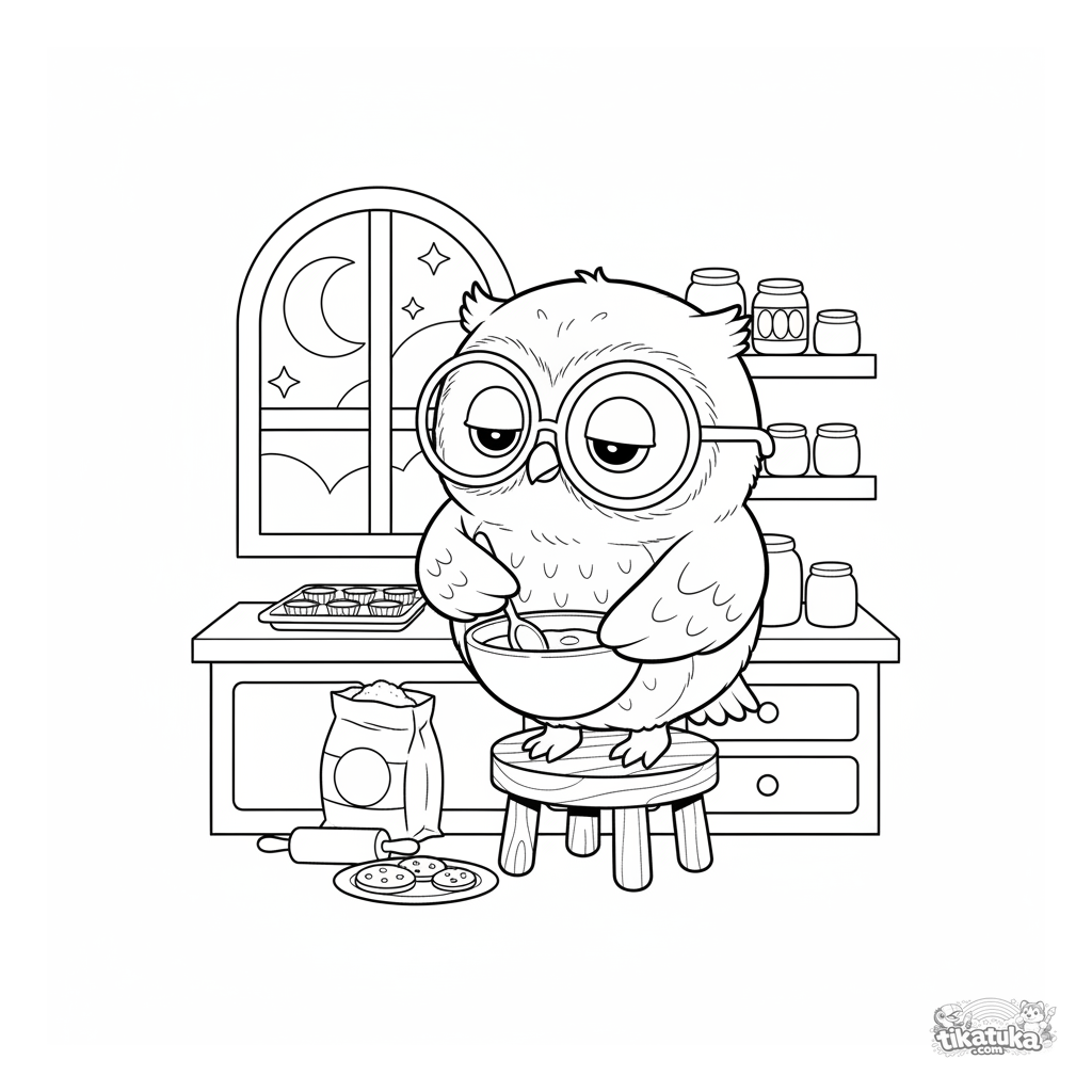 Ausmalbild für Kinder 4-6: Süße Eulen-Bibliothekarin Oof backt Cupcakes in einer gemütlichen Mini-Küche. Einfache Linien, skandinavischer Plüschtier-Stil.