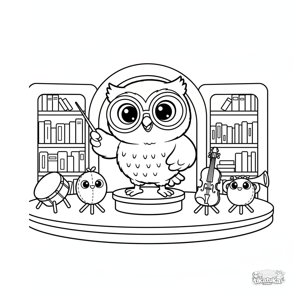 Ausmalbild für Kinder 4-6: Eule Oof dirigiert ein kleines Orchester aus Plüschinstrumenten. Weiche puppenähnliche Formen, saubere Umrisse, skandinavischer Stil, lustiges musikalisches Thema.