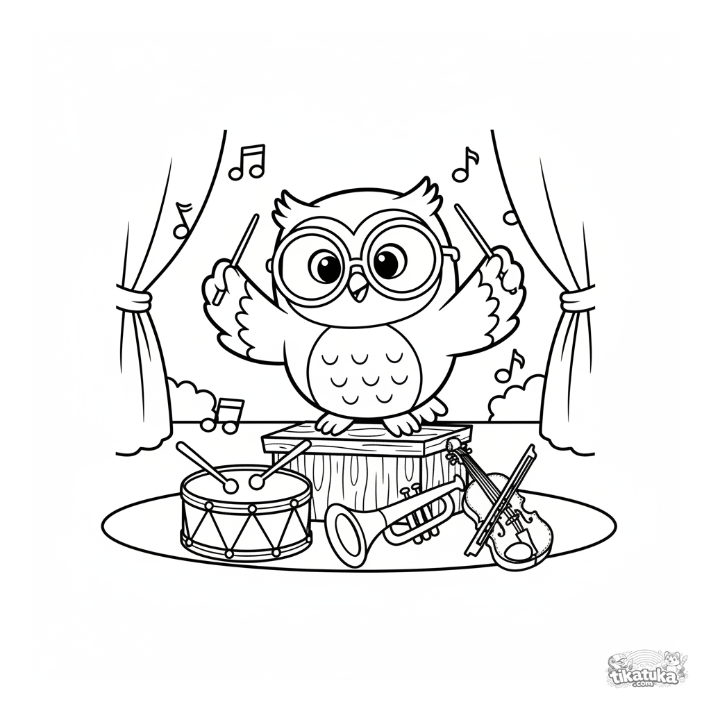 Ausmalbild für Kinder 4-6: Eule Oof dirigiert ein fröhliches Orchester aus Spielzeuginstrumenten. Weicher Puppenstil, schwebende Noten.