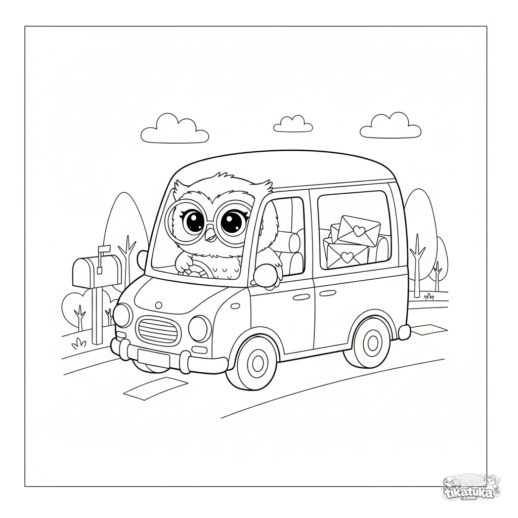Ausmalbild für Jungen 4-6: Eule Oof fährt einen winzigen Posttransporter und liefert Briefe aus. Skandinavischer Plüschstil, einfache Formen von Fahrzeug und Straße.