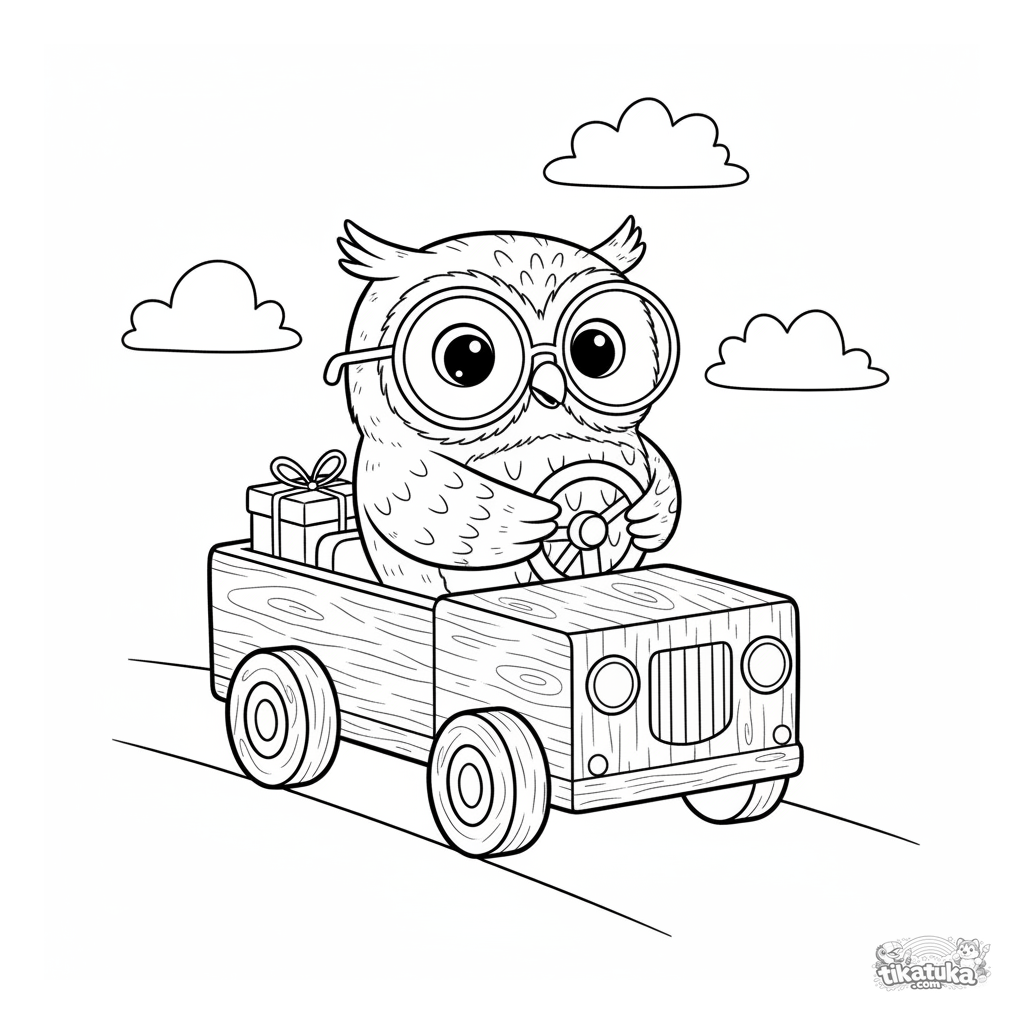 Ausmalbild für Jungen 4-6: Eule Oof fährt einen Holzspielzeug-Lieferwagen. Klare Umrisse, skandinavischer Spielzeugstil.