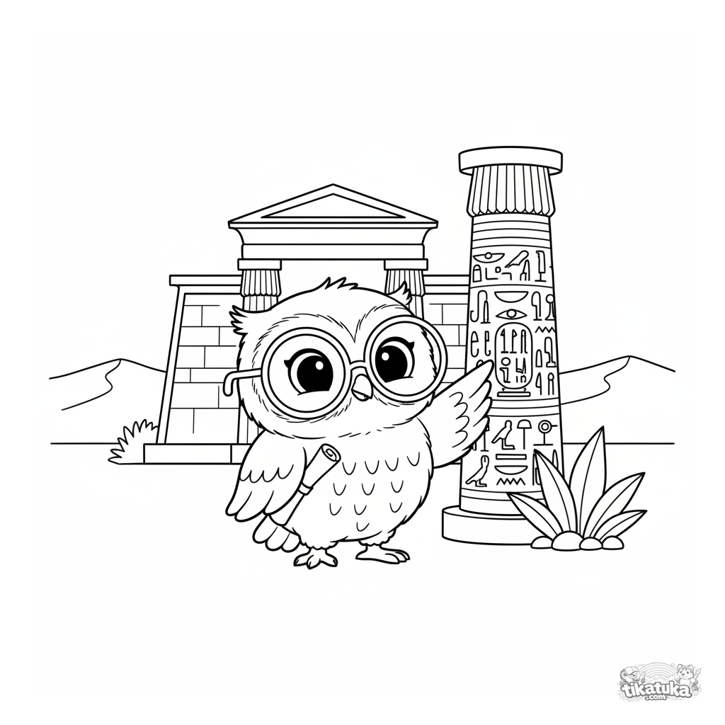 Ausmalbild für Kinder 4-6: Eule Oof erkundet einen antiken ägyptischen Tempel. Einfache geometrische Formen im Holzspielzeug-Stil, saubere Linien, pädagogisches Thema.