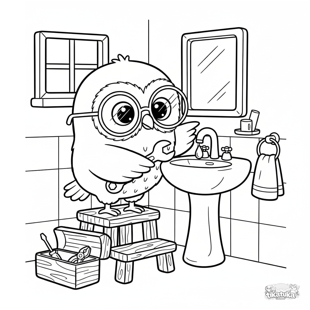 Ausmalbild für Kinder 4-6: Eule Oof arbeitet als Klempner und repariert einen tropfenden Wasserhahn. Geometrische Formen im Holzspielzeug-Stil, saubere Linien, pädagogisches Berufethema.