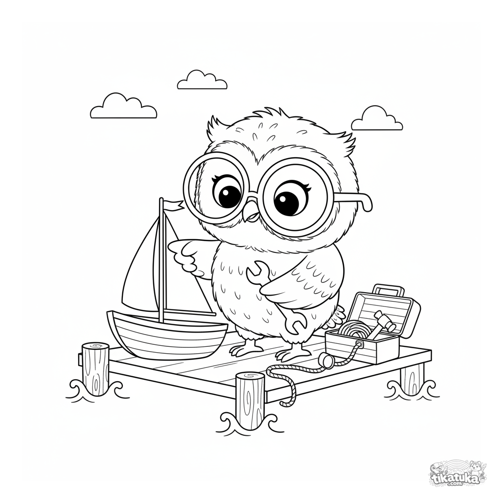 Kinder-Ausmalbild: Eule Oof repariert auf einem Holzsteg ein kleines Segelboot mit Werkzeugen. Skandinavischer Holzspielzeug-Stil, einfache Formen.