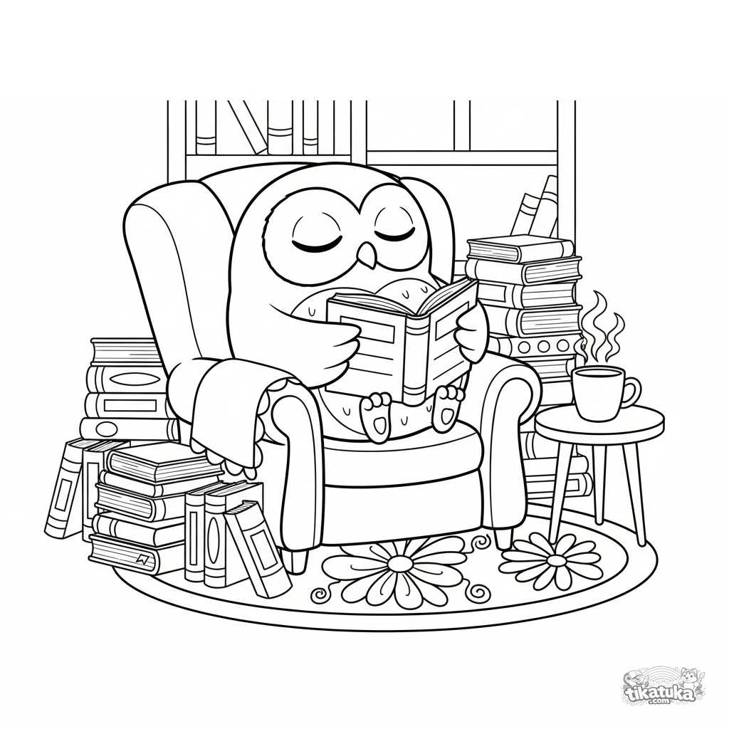 Ausmalbild für Kinder 4-6: Eule Oof liest ein Buch in einer gemütlichen Bibliotheksecke mit einem Sessel und Buchstapeln. Ruhige, detaillierte Szene.