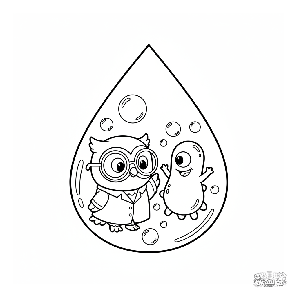 Ausmalbild mit Eule Oof im Laborkittel, der ein freundliches Bakterium in einem Wassertropfen beobachtet. Für Kinder von 4-6 Jahren.