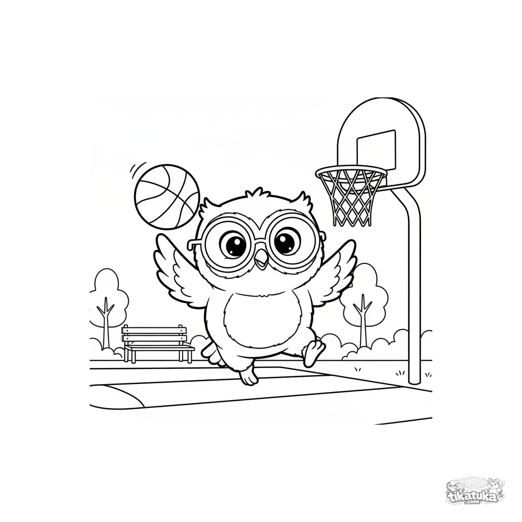 Ausmalbild für Kinder 4-6: Plüscheule Oof spielt Basketball im Park. Dynamische Pose, saubere Umrisse, einfache Formen, skandinavischer Spielzeugstil, Sportthema.