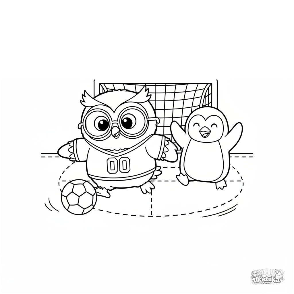 Ausmalbild für Kinder 4-6: Eule Oof im Trikot spielt Fußball mit einem Pinguin-Freund. Dynamische Sportszene, klare Umrisse.