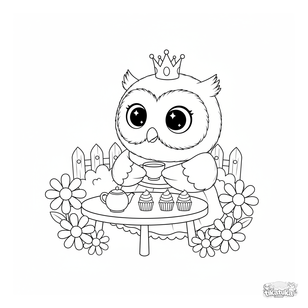 Ausmalbild mit Eule Oof als Prinzessin bei einer zarten Garten-Teeparty. Für Mädchen von 4-6 Jahren.
