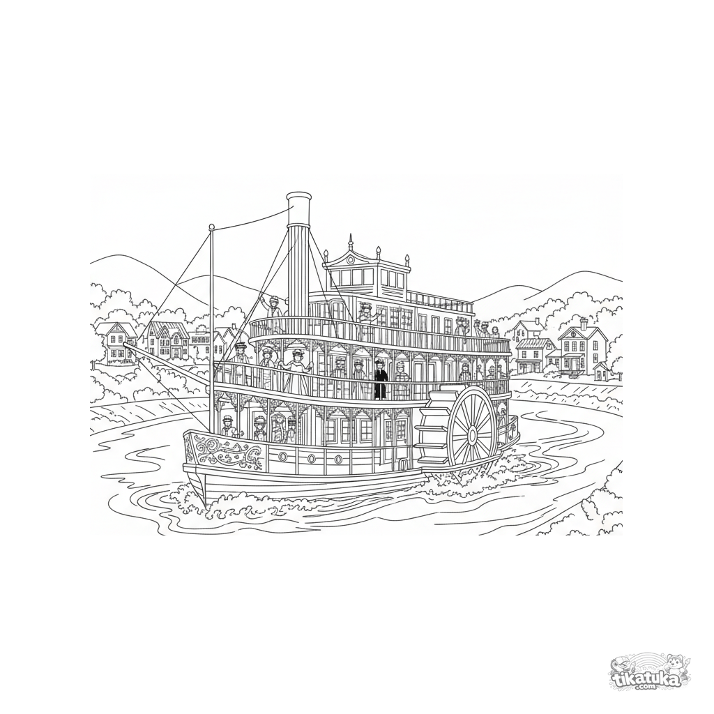 Detailliertes Ausmalbild für ältere Kinder 10-12: Ein Raddampfer im Vintage-Stil fährt um eine Flussbiegung, Passagiere winken von den Decks. Texturen, verzierte Details, mehrschichtige Szene.