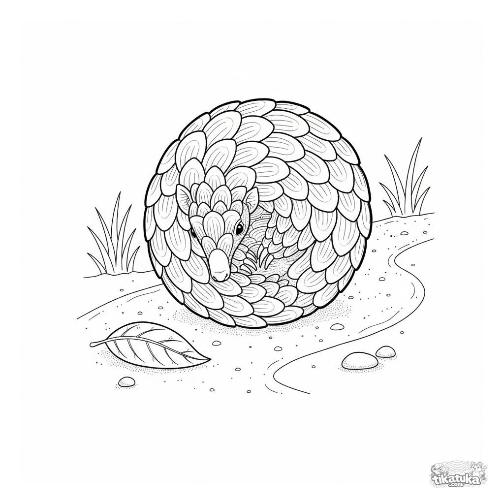 Ausmalbild eines Schuppentiers, das sich auf einem Sandpfad zu einer Kugel einrollt. Für Kinder von 6-9 Jahren. Realistische Darstellung.