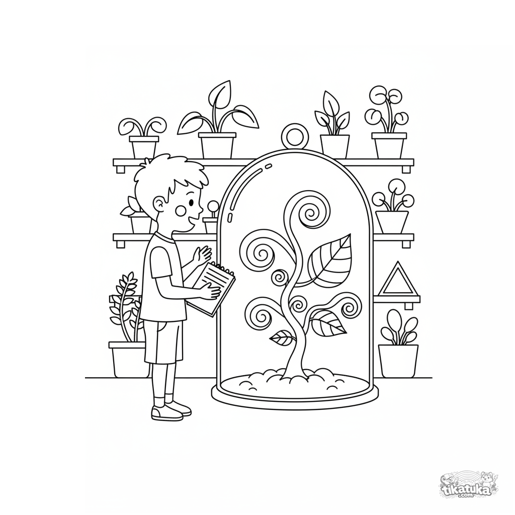 Ausmalbild für Kinder von 7-9 Jahren im Paper-Cut-Stil: ein Junge untersucht eine seltsame Pflanze in einem geheimen Labor.