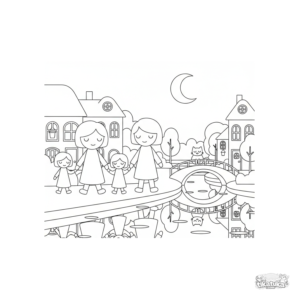 Ausmalbild für Kinder von 4-6 Jahren im Scherenschnittstil: eine Familie spaziert nachts an einem Kanal mit leuchtenden Laternen. Eine beruhigende Szene mit klaren Silhouetten.