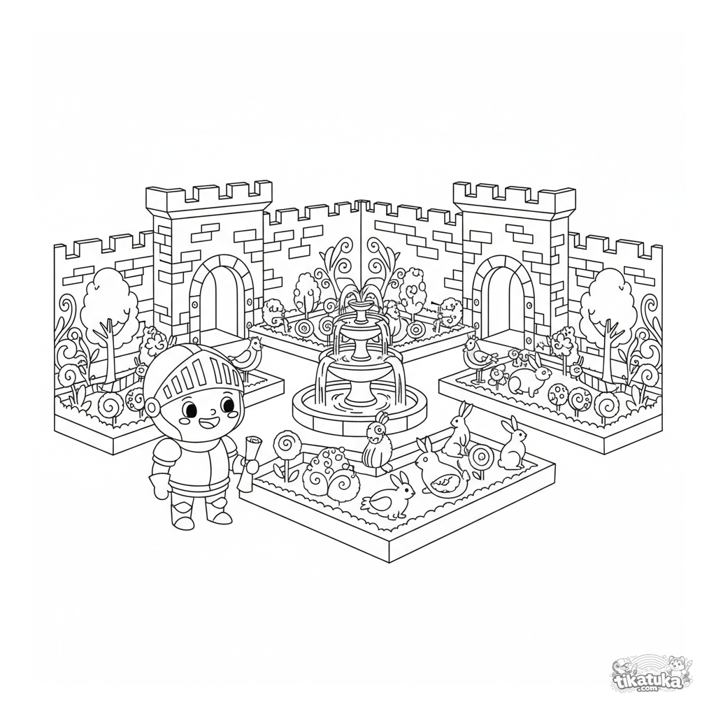 Detailliertes Ausmalbild im Scherenschnitt-Stil eines Burghofs für Kinder von 7-12 Jahren. Mit zentralem Brunnen, Knotengärten mit Formschnitt und einem freundlichen Ritter.