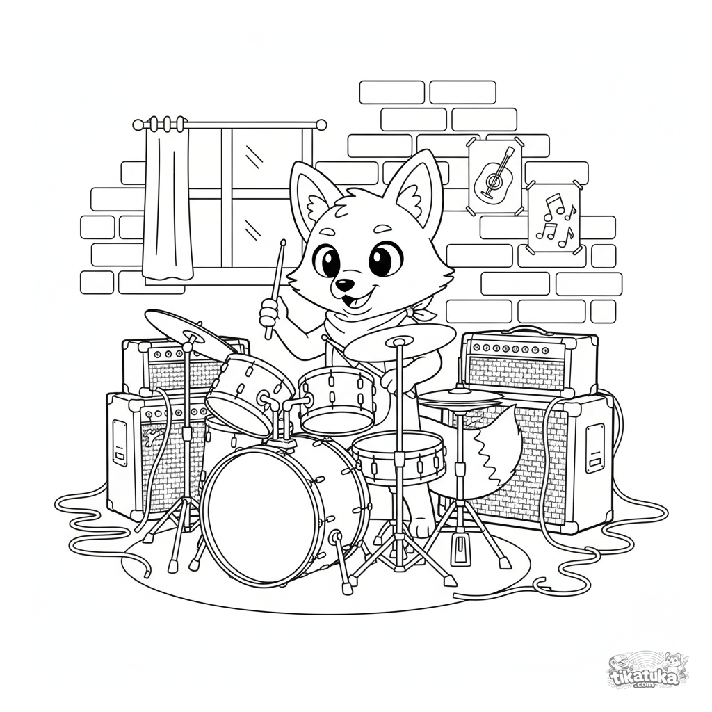 Ausmalbild für Kinder 5-8: Ein Fuchs-Schlagzeuger rockt am Schlagzeug in einer Garage. Papierschnitt-Stil Szene mit Verstärkern.
