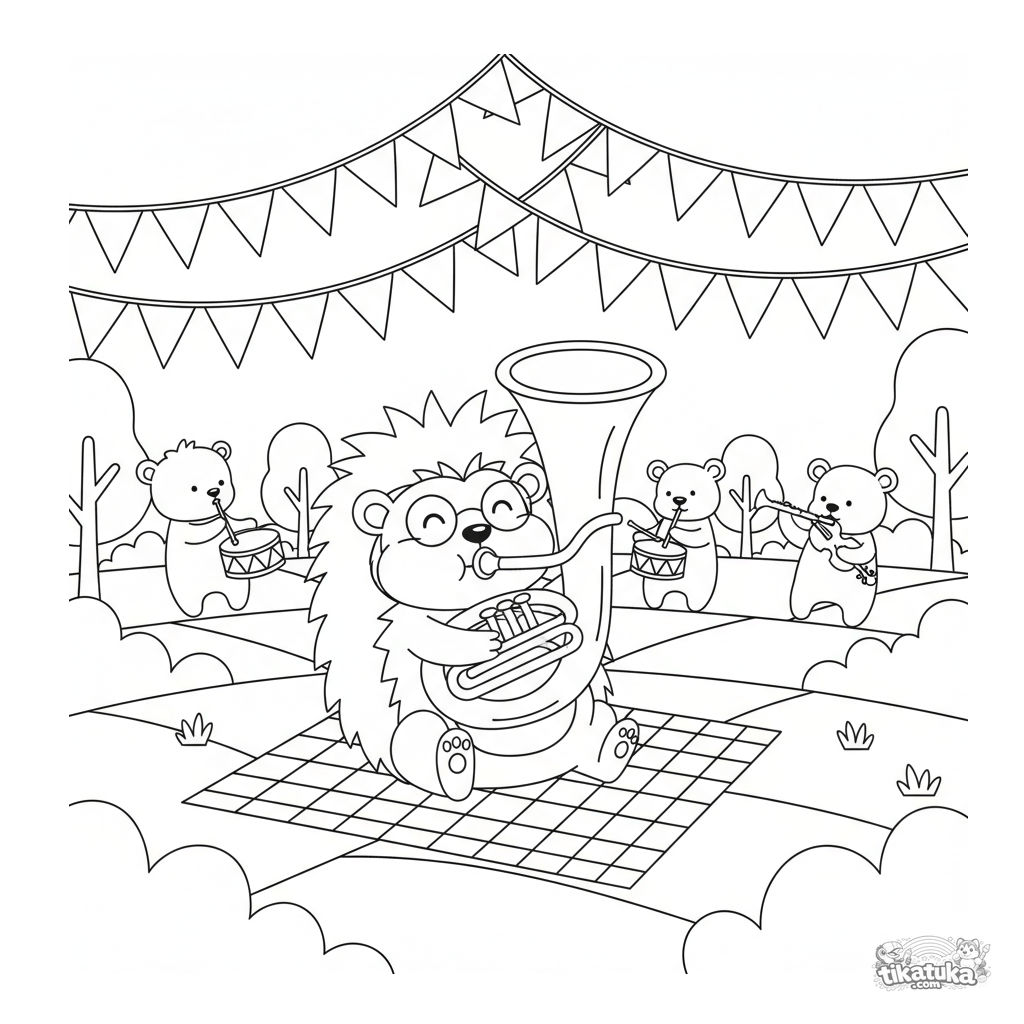 Ausmalbild für Kinder 5-8: Ein Igel mit Brille spielt fleißig Tuba auf einer Festivalwiese. Eine lustige Szene im Papierschnitt-Stil mit Wimpelketten.