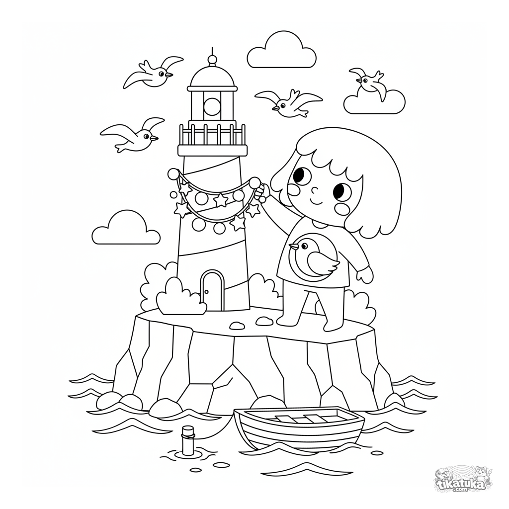 Ausmalbild für Kinder von 4-6 Jahren im Scherenschnittstil: ein Wärter schmückt einen gestreiften Leuchtturm an einer Klippe. Klare Silhouetten und einfache Formen.