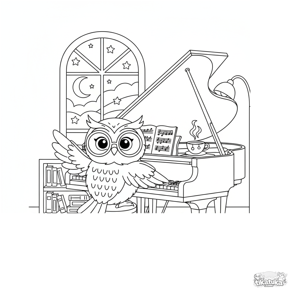 Ausmalbild für Kinder: Eine weise Eule mit Brille spielt mit ihren Flügeln einen Flügel in einem gemütlichen, mondbeschienenen Musikzimmer.
