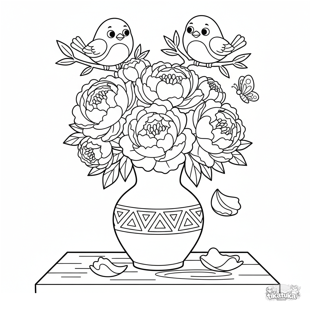 Ausmalbild für 7-9 Jahre: Ein üppiger Pfingstrosenstrauß in einer Keramikvase auf einem Tisch, im klaren Paper-Cut-Stil.