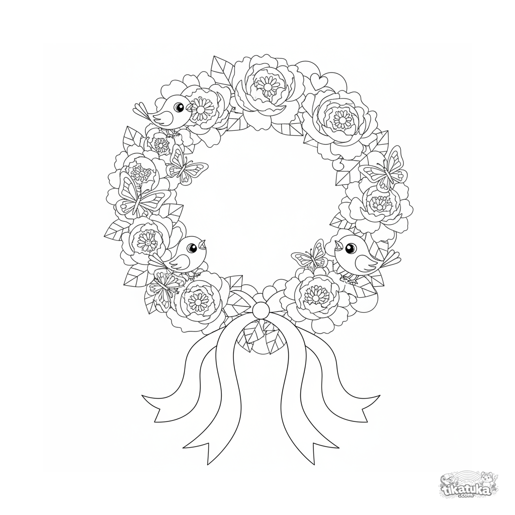 Ausmalbild für Kinder 7-9: ein dekorativer Pfingstrosenkranz im Papierschnitt-Stil mit Bändern. Knackige geometrische Umrisse, symmetrisches Design.