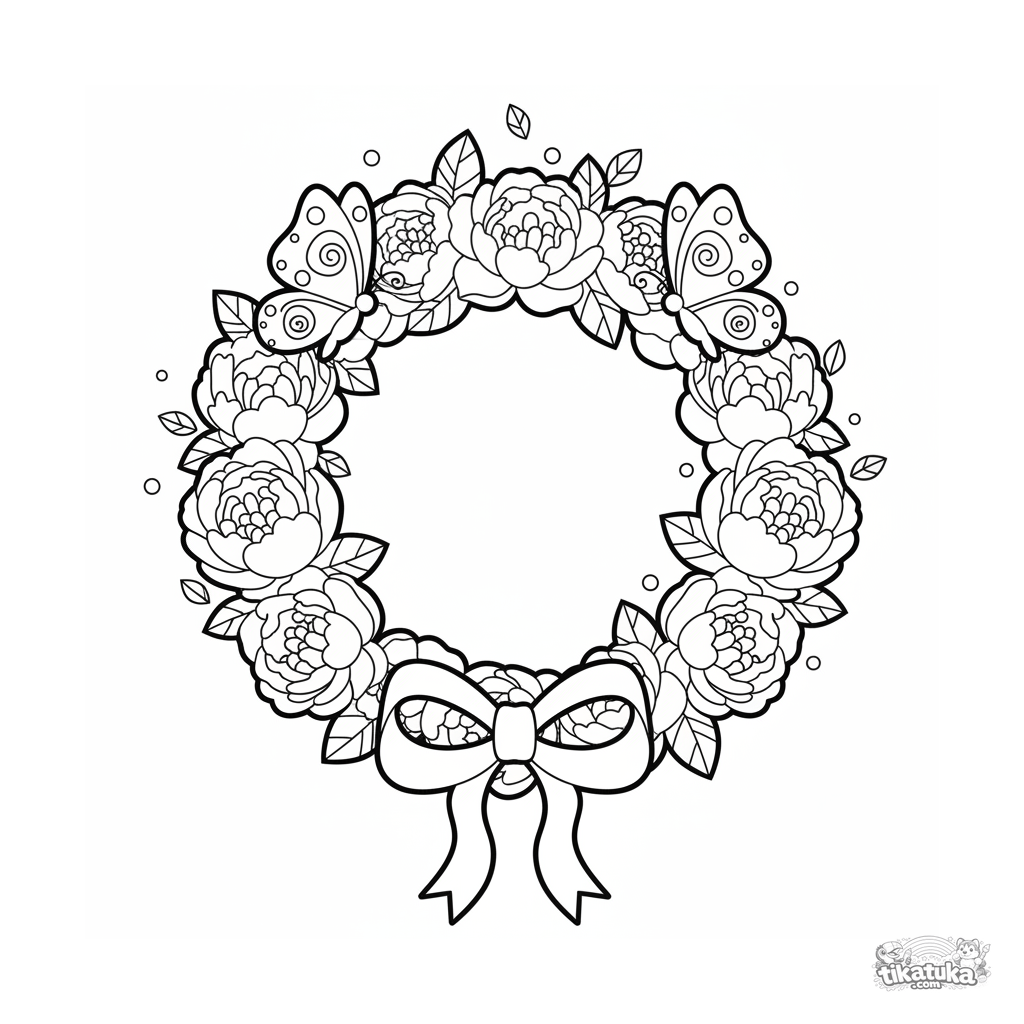 Ausmalbild für 7-9 Jahre: Ein dekorativer Pfingstrosen- und Blätterkranz im Papierschnitt-Kunststil mit symmetrischen Schmetterlingen und einer Schleife.