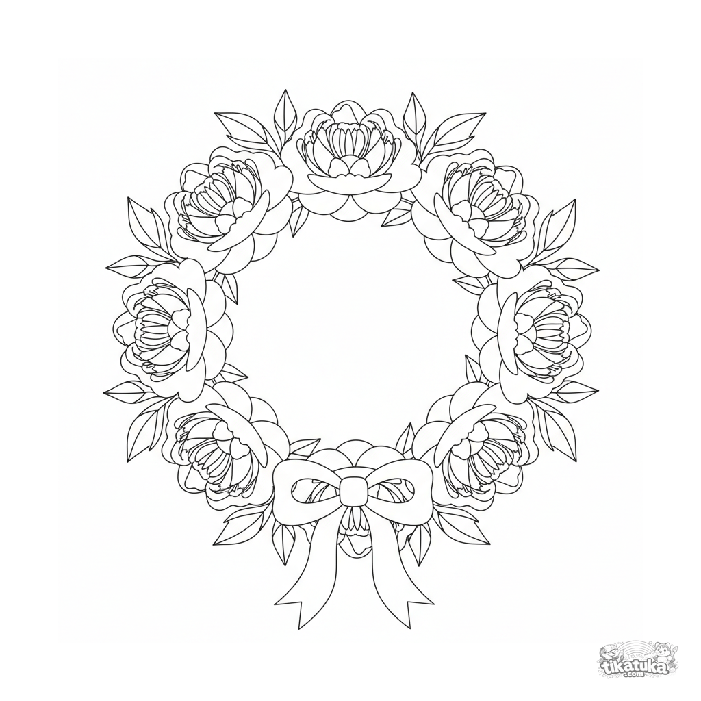 Ausmalbild für 4-6 Jahre: Ein runder Kranz aus papiergeschnittenen Pfingstrosen mit Blättern und einer großen Schleife. Saubere Umrisse, symmetrische Komposition.