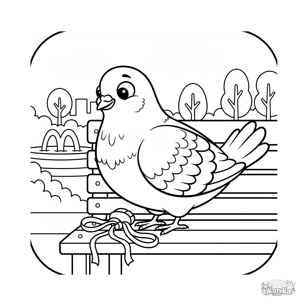 Ausmalbild für Kinder: Eine Stadttaube sammelt Bänder in einem Park, im Paper-Cut-Stil. Für Kinder von 4-7 Jahren geeignet.