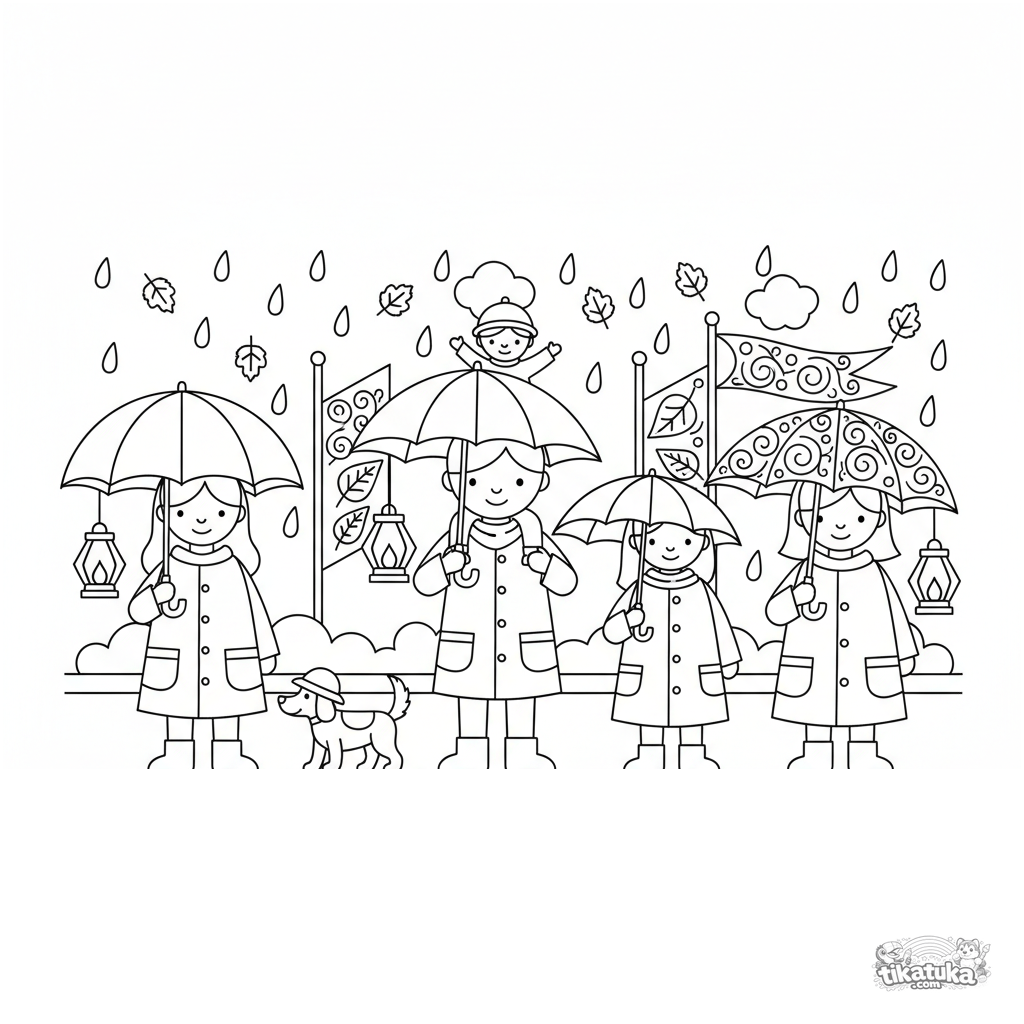 Komplexes Ausmalbild für Kinder 10-12 im Papierschnitt-Stil: Silhouetten von Menschen bei einer Herbststraßenparade im Regen. Grafische, geschichtete Komposition.