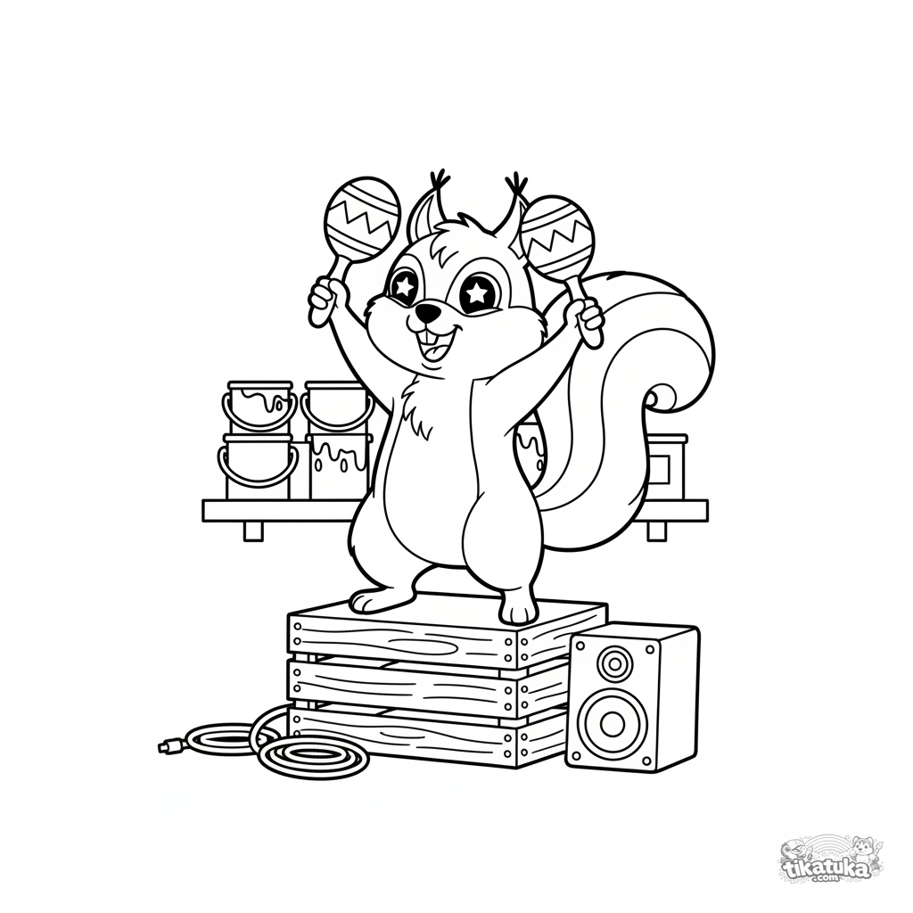 Ausmalbild für Kinder: ein energisches Eichhörnchen schüttelt Maracas in einer Garage. Dynamische Szene im Paper-Cut-Stil.