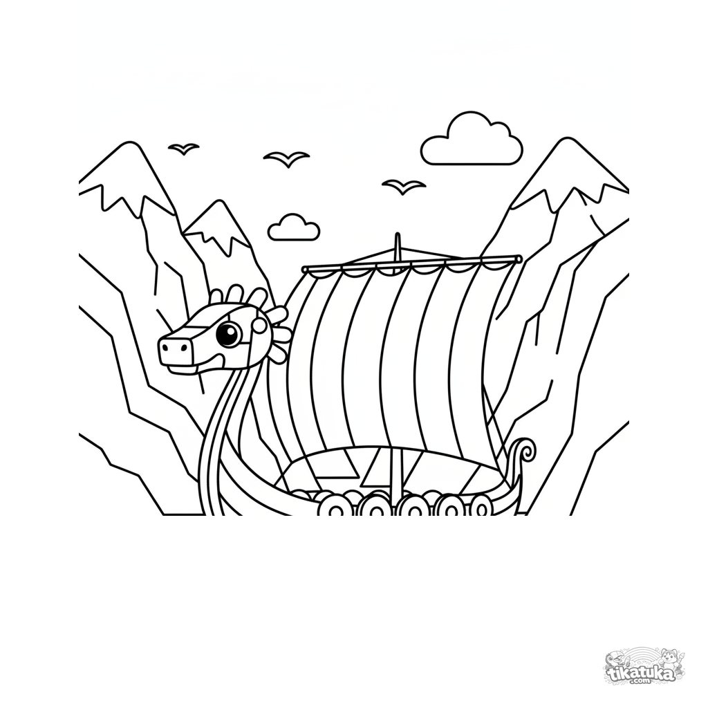 Ausmalbild für Kinder 7-9 im Papierschnitt-Stil: ein Wikingerlangschiff segelt durch einen Fjord. Klare Silhouetten, geschichtete Berge.