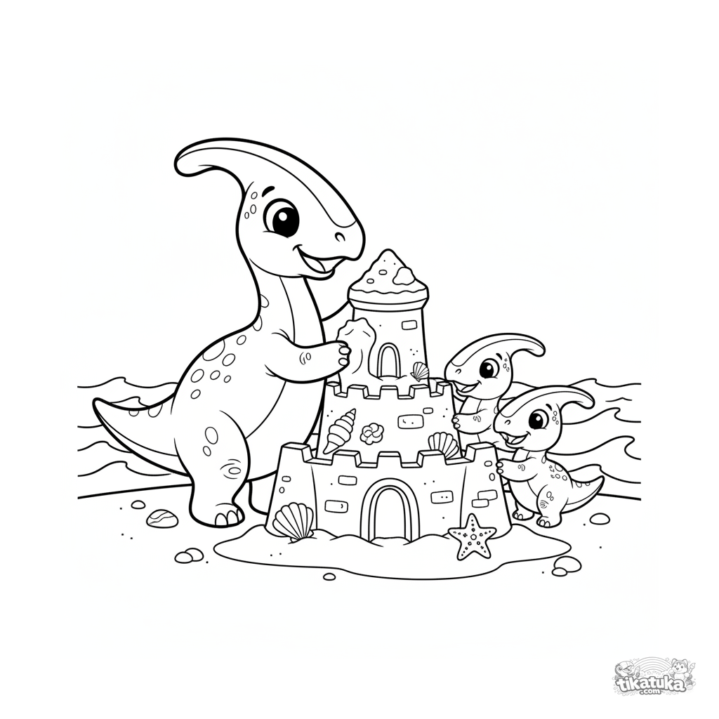 Ausmalbild für Kinder 4-6: eine Parasaurolophus-Dinosaurierfamilie baut eine Sandburg am Strand eines urzeitlichen Ozeans. Niedliche Dinoszene zum kreativen Ausmalen.