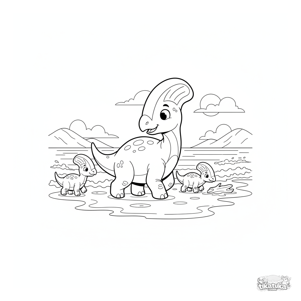 Ausmalbild für Kinder von 4-6 Jahren: eine Familie von Parasaurolophus-Dinosauriern läuft am Sandstrand eines uralten Ozeans entlang.