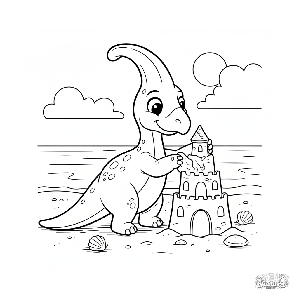 Ausmalbild für Kinder 4-6: ein neugieriger Parasaurolophus baut eine Sandburg am Strand eines urzeitlichen Ozeans. Niedliche und einfache Szene.