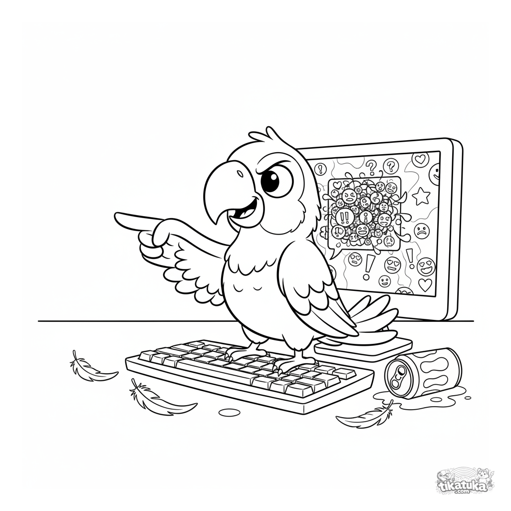 Ausmalbild für Kinder 7-12: ein dramatischer Papagei zeigt auf ein chaotisches Chat-Fenster auf einem Computermonitor. Lustige Reaktionsszene im Retro-Stil.