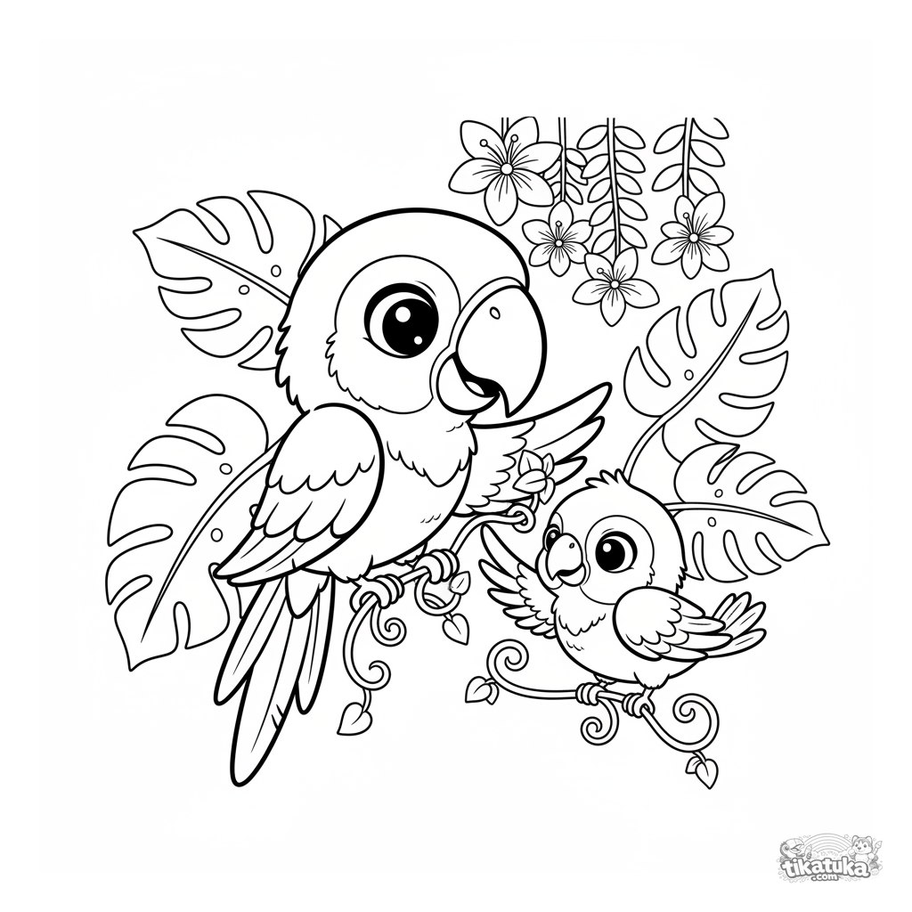 Ausmalbild für Kinder: Ein Papagei hilft seinem Vogel-Freund, sich aus einer Ranke zu befreien. Für Kinder von 4 bis 6 Jahren, Freundschaftsthema.