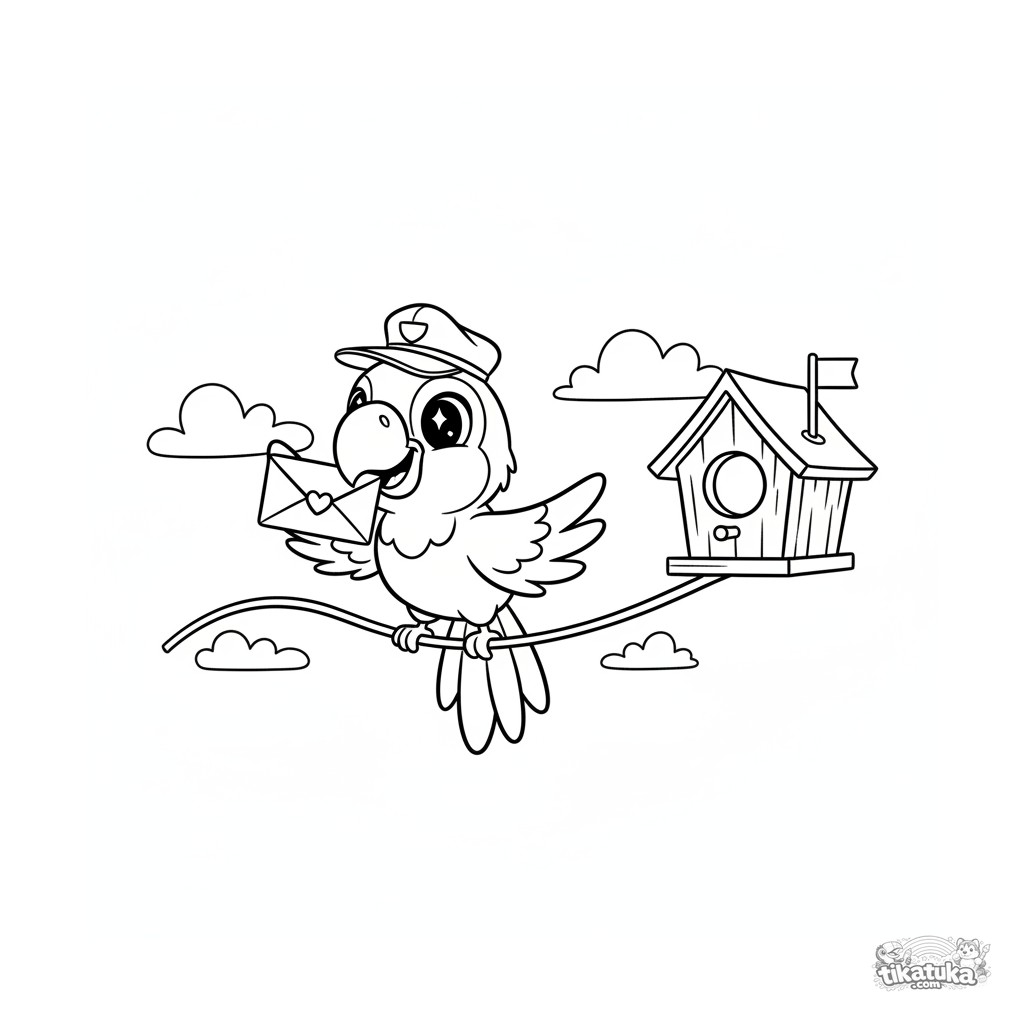 Ausmalbild für Kinder 4-6: ein fröhlicher Papagei als Postbote bringt einen Brief zu einem Vogelhaus. Helle, lustige Szene mit einem Umschlag und einer Postmütze.