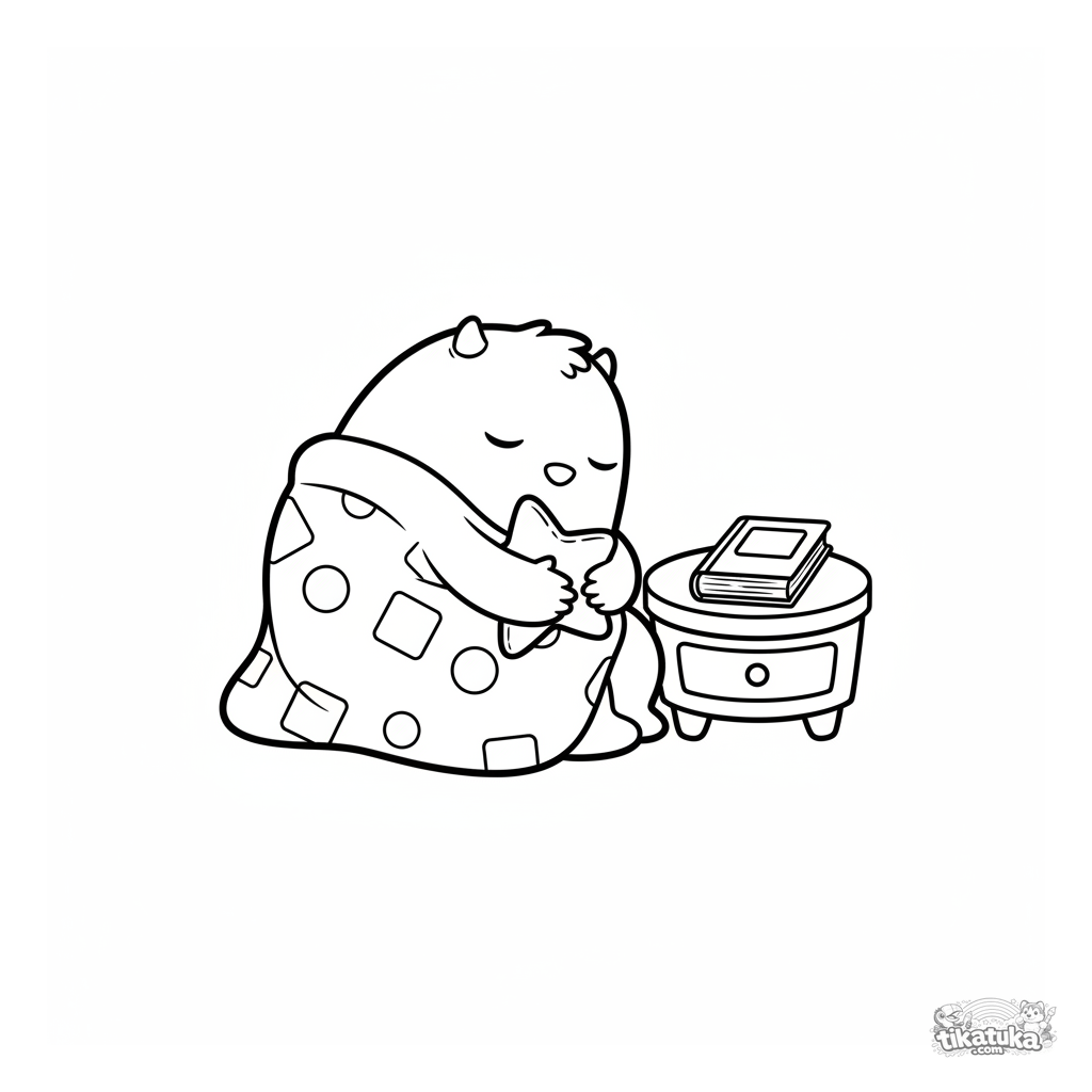 Einfaches Ausmalbild für Kleinkinder 2-3: Ein birnenförmiges Monster schläft fest, ein Spielzeug umarmend.