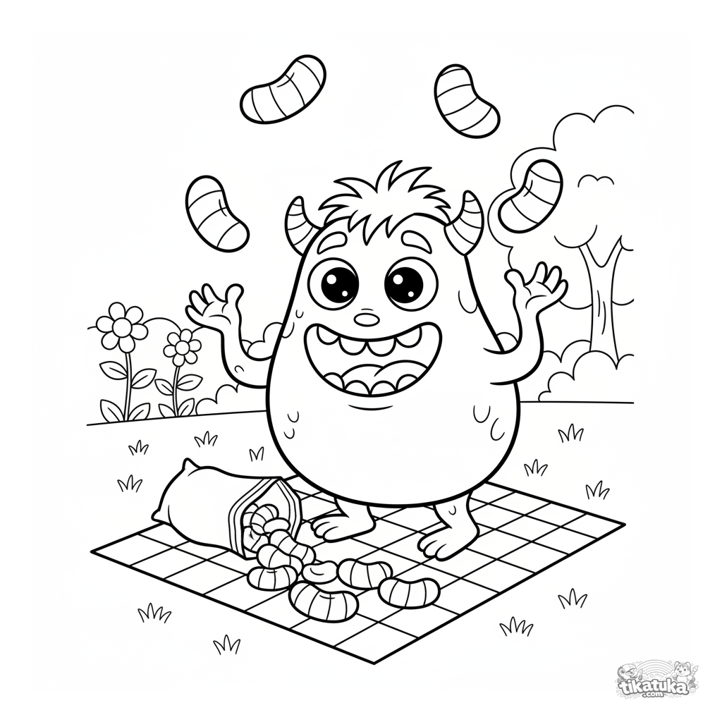 Ausmalbild für Kinder 7-9: Ein fröhliches, birnenförmiges Monster jongliert mit Riesen-Gummibärchen auf einem Picknick. Dynamische Szene.