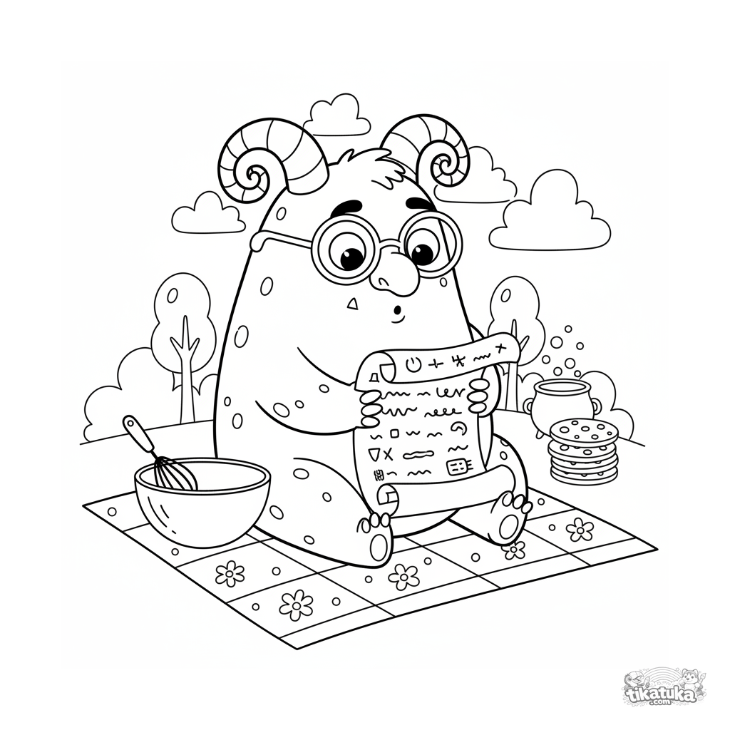 Ausmalbild für Kinder 4-6: Ein birnenförmiges Monster mit Brille sitzt auf einem Picknick und liest aufmerksam ein großes Rezeptbuch für Monstersüßigkeiten. Eine niedliche und lehrreiche Szene.