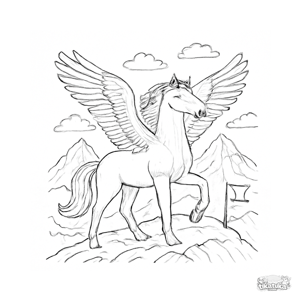 Ausmalbild für Kinder. Majestätischer Pegasus auf verschneitem Berggipfel mit Flagge, ausgebreitete Flügel vor Gipfeln und Himmel. Kostenlos herunterladen.
