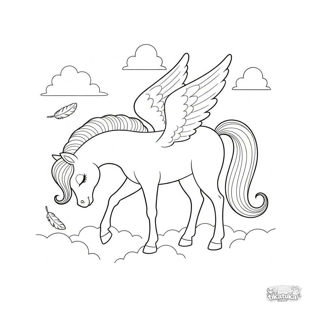 Ausmalbild eines magischen Pegasus für Kinder von 3-6 Jahren. Ein geflügeltes Pony weidet friedlich auf flauschigen Wolken in einer Himmelswiese.