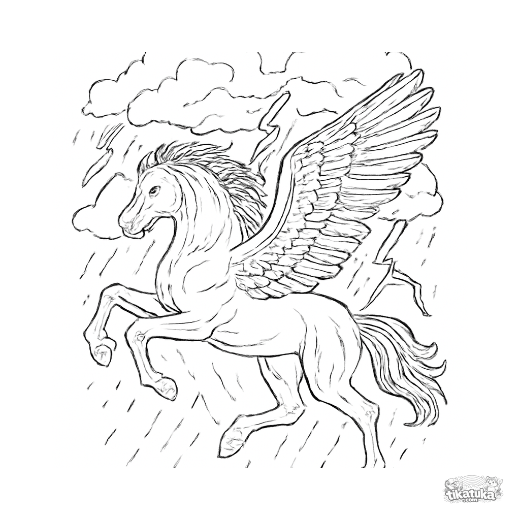 Ausmalbild für Kinder. Schwarzer Pegasus galoppiert durch Gewitterwolken mit Blitzen, ausgebreitete Flügel im dynamischen Flug. Kostenlos herunterladen.