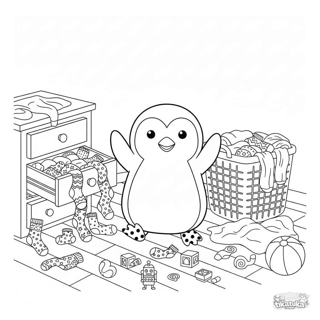 Ausmalbild für Kinder von 7 bis 12 Jahren: ein fröhlicher Pinguin feiert den Sieg in nicht passenden Socken inmitten eines Zimmers mit verstreuter Wäsche. Lustige und nachvollziehbare Szene.