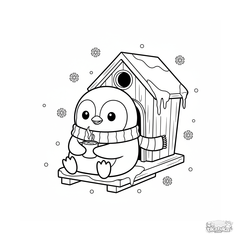 Ausmalbild für Kinder 4-6: Ein süßer Pinguin mit Schal entspannt auf der Veranda eines Wintervogelhauses. Niedliche, einfache Szene im Chibi-Stil.